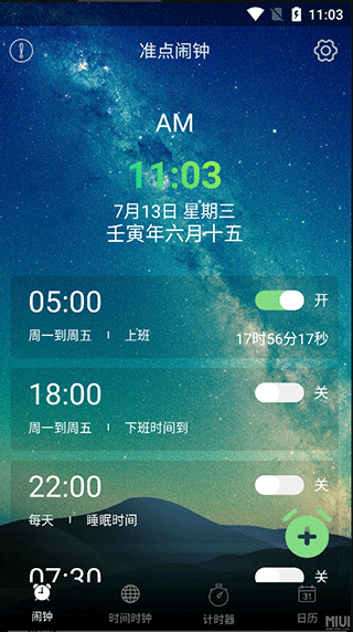 1、多种类型的闹钟:包括一次性闹钟、工作日闹钟、每日重复闹钟、倒计时闹钟、随机闹钟等,与您的生活和工作安排完美结合。