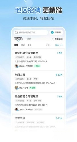 广州直聘是一款聚焦本地的求职招聘平台,能有效提升企业与求职者间的沟通效率。用户可一键向多家公司投递简历,实时掌握录取进展,快速完成对接;甚至能在短时间内推进面试与入职流程。平台还会依据用户需求智能匹配合适岗位,助力用户找到心仪工作。