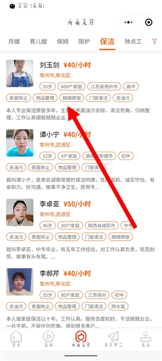 在保洁阿姨的列表里,找到你想选的目标阿姨,点击她就能进入详情页面。