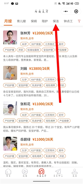 在阿姨列表页面,选择保洁分类,进入保洁阿姨列表。