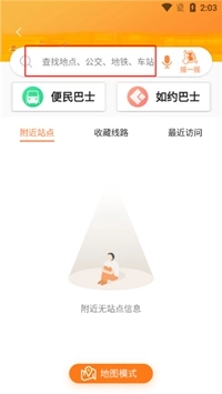 我们点击其中的公交功能后,用户即可启动定位,获取当前所在的站台位置;同时,也能在搜索框中输入自己想要查询的公交路线。
