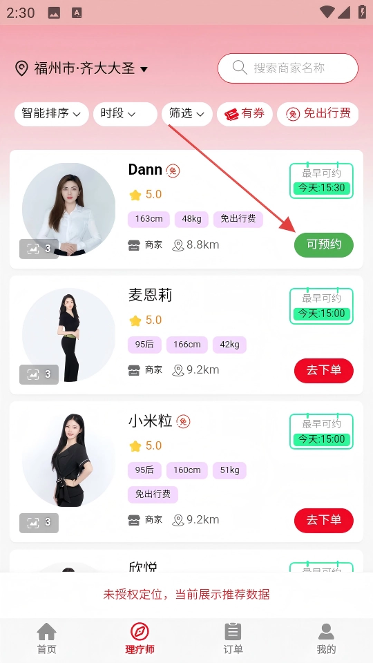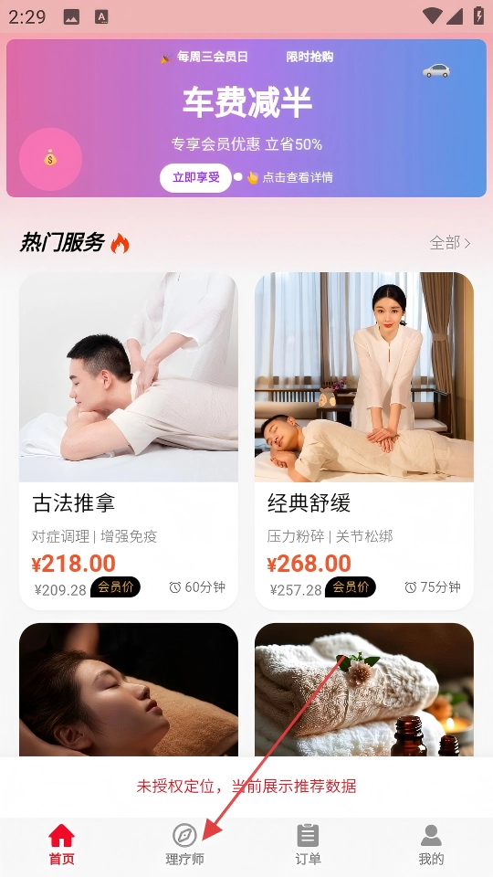 点击底部【理疗师】选项,进入理疗师列表页面。