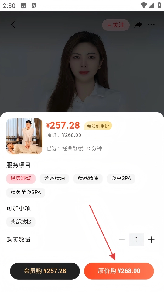 在服务项目选择页面,选定服务项目并确定购买数量后,点击“原价购”按钮。