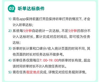 听单任务的有效时长仅统计每日7:00至19:00期间的听单时长,在此时间段之外的听单时长不纳入有效任务时长计算。