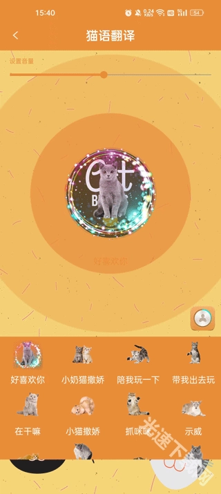 猫咪语言翻译功能,能呈现常见的猫咪喵喵叫声,还支持记录翻译内容以便与猫咪互动。