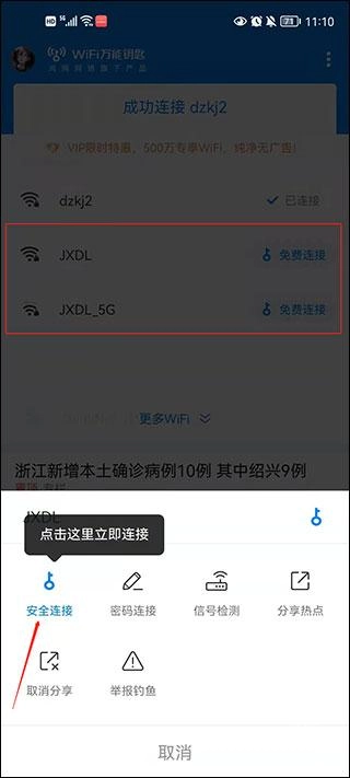 通过例图可以看到,名称后面带有钥匙图标的就是支持自动连接的热点,我们只需点击“安全连接”按钮,就能自动完成WiFi的连接操作了。