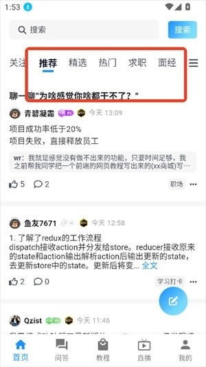 打开软件进入后,在首页能看到精选、推荐、热门、求职等板块的内容。