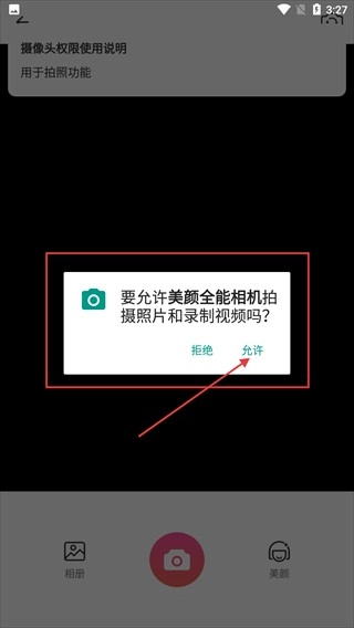 当弹出【是否允许美颜全能相机拍摄照片和录制视频?】的提示框时,点击【允许】按钮以获取相机权限。