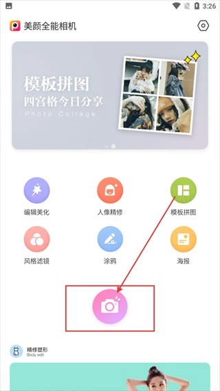 在【美颜全能相机】的界面里,点击位于中间位置的粉色相机按钮,就能进入与拍照相关的流程。
