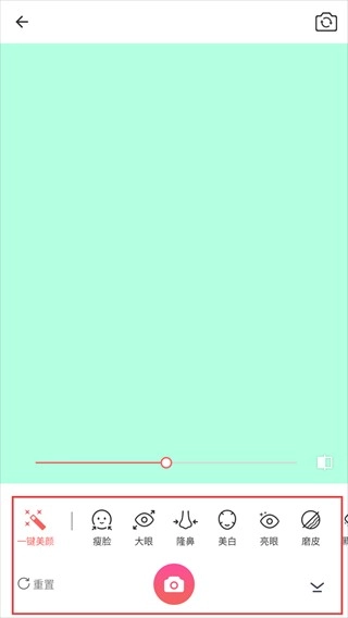 进入相机界面后,点击底部右侧的【美颜】按钮,就能进入美颜功能设置页面。