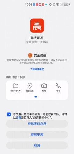 接下来请勾选“已了解此应用未经检测……”这一选项,然后点击“继续安装”按钮。另外,也可以点击相关选项了解纯净模式的具体内容。