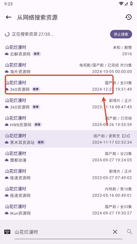 点击选择的影片资源后,会出现多个搜索资源渠道。