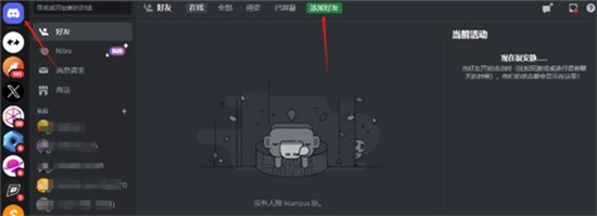 打开Discord后,你会看到一个标着【好友】的选项卡,点击它之后,就能找到【添加好友】这个选项了。