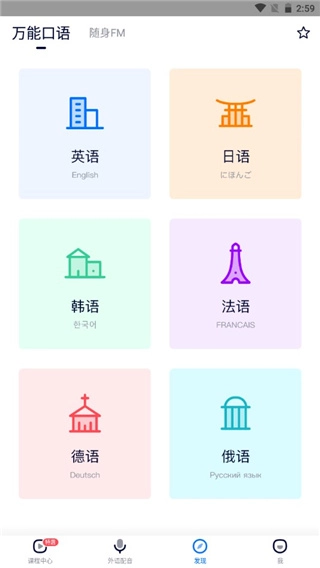 在发现页面里,有适合学习万能口语的内容,像旅游、面试、交流等不同类型的都能找到。