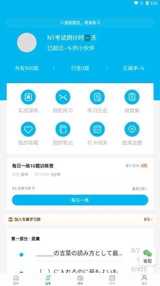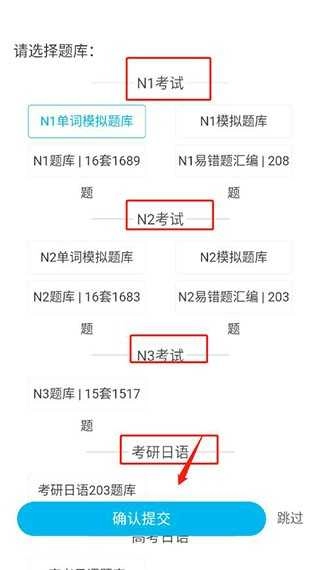 这里提供多种类型的题库,涵盖N1、N2、N3考试以及考研日语等,选定后点击确认就能开始。