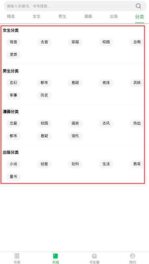 在书城浏览时,你会发现这里汇聚了为各类读者群体量身挑选的丰富内容,涵盖精选推荐、女生专区、男生专区、漫画以及出版书籍等多个板块。