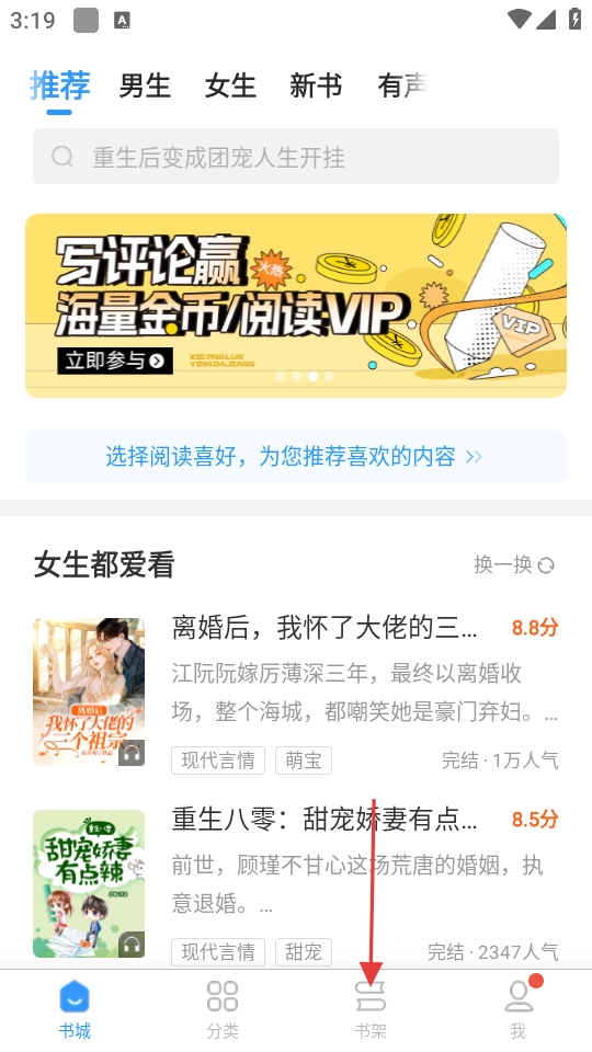 在书城界面,点击底部的【书架】按钮,即可进入书架页面。