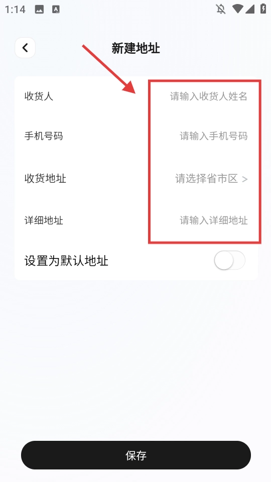 请按顺序填写收货人姓名、手机号码,接着选择对应的省、市、区,再补充详细的地址信息,全部填写完毕后点击【保存】按钮,这样就完成了收货地址的设置。