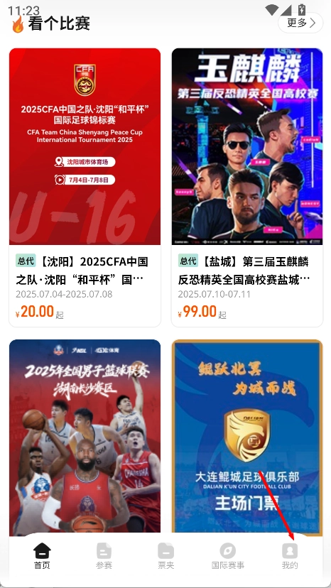 打开看个比赛,进入首页点击右下角“我的”。