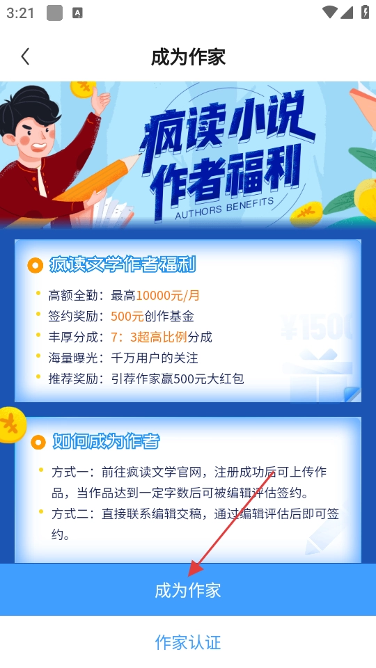 在成为作家的页面里,点击【成为作家】按钮,就能依照提示的步骤完成作家身份的申请流程。