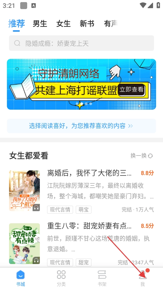 在书城界面,点击底部的【我】按钮,进入个人页面。