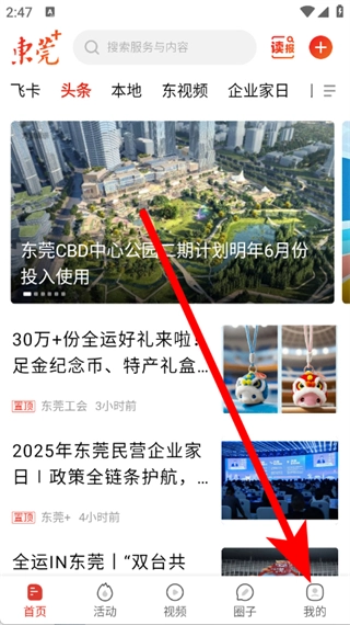 打开东莞+,点击底部导航栏我的,进入页面。