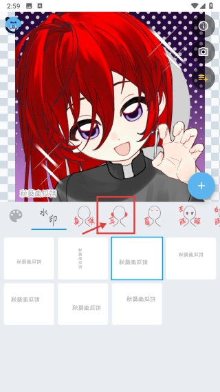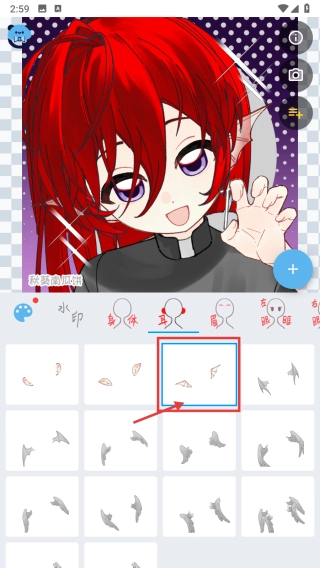 在编辑页面,点击耳部件分类,展开耳饰素材列表。