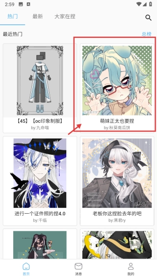 在热门素材专区,点击“萌妹正太也要摆”的素材封面,即可进入素材编辑页面。