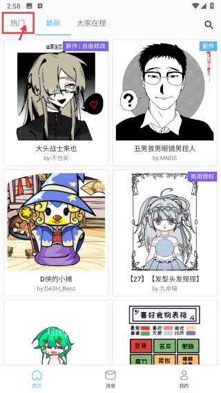 打开绘画创作功能,点击热门分类标签,进入热门素材专区。