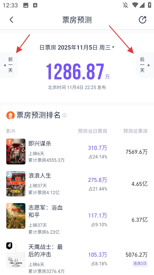 可点击【前一天】或【后一天】按钮切换日期,以查看不同日期的票房预测情况。