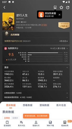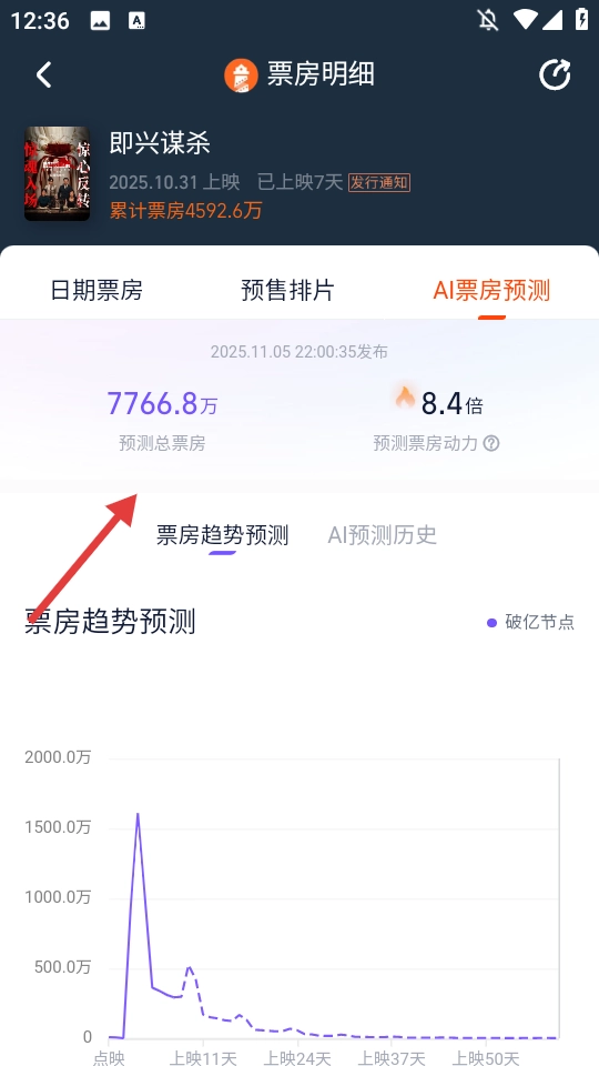 点击目标影片,进入票房明细页面,查看该影片的票房趋势预测等详细数据。