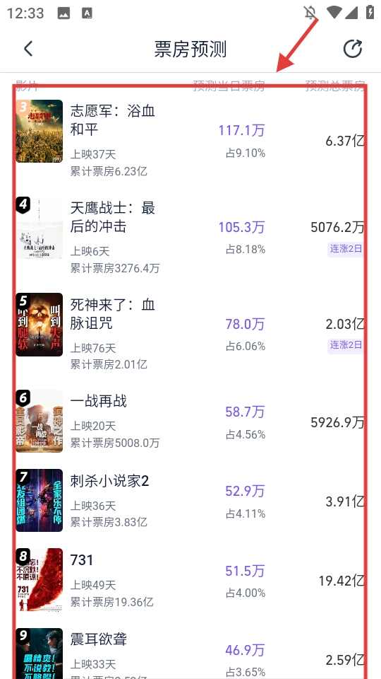 浏览票房预测清单,了解各影片的当日预测票房、总预测票房等相关信息。