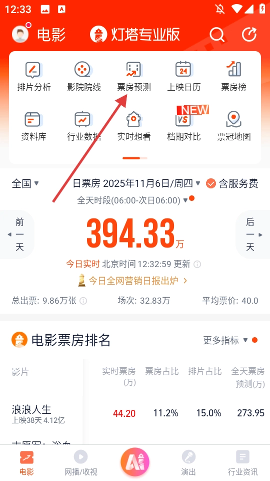 打开软件进入首页后,这里会实时更新最新的电影票房排名,你可以随意点击其中一部电影。