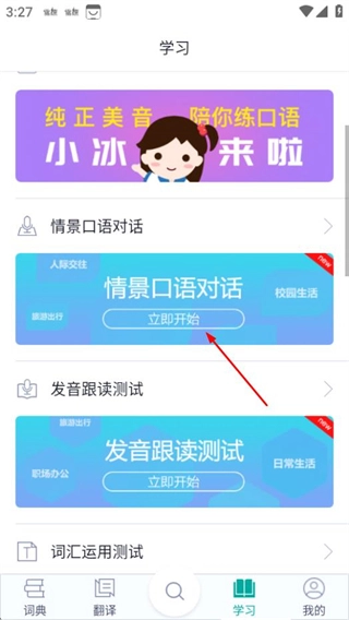 在学习页面,找到情景口语对话板块,点击其中的“立即开始”按钮,即可进入相应页面。