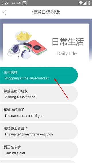 在测试情景选择页面,挑选你感兴趣的情景(例如超市购物),然后进入对话练习页面。