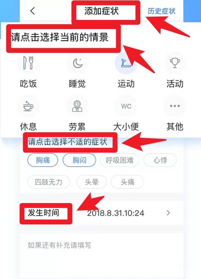 在症状添加页面,用户需要依据当下的具体情况挑选对应的标签,勾选身体出现的不适症状,并且填写症状发生的时间,以此完成记录。