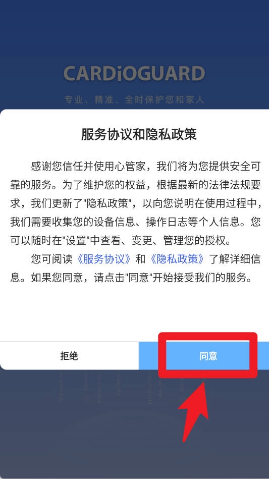 首次使用时,用户需阅读服务协议与隐私政策,点击同意按钮后才能进入下一步操作。
