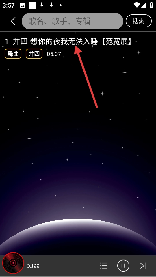 点击搜索结果里的【并四-想你的夜我无法入睡【范宽展】】这一条目,就能开始播放这首歌曲了。