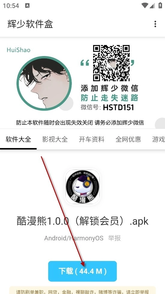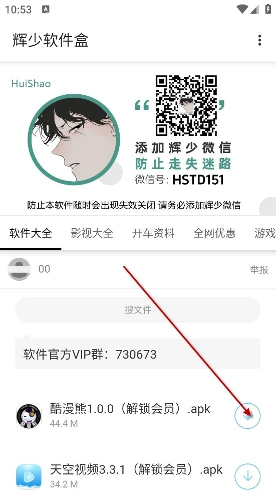 找到你想要的软件后,点击箭头指示的位置,就像灵宝小编选择的酷漫熊1.0.0解锁会员版那样操作即可。
