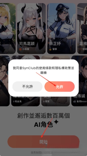 打开SynClub软件后点击“开始”按钮,接着同意并允许使用隐私协议。