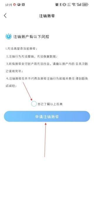 在账号注销确认页面,勾选【我已知晓上述后果】并点击【申请注销账号】按钮,就能完成账号注销流程。