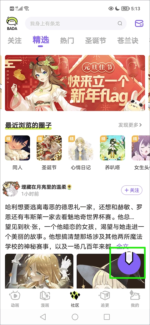 首先,启动软件,在社区页面找到并点击绿色方框里的功能按钮。