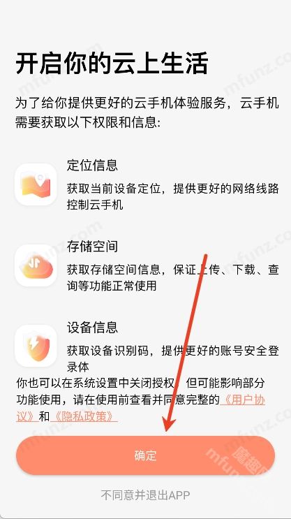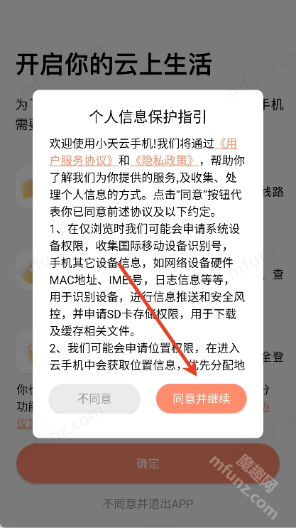 进入小天云手机点击同意并继续
