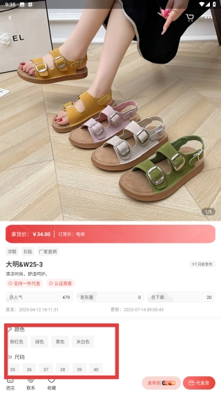 浏览凉鞋的商品详情页面,挑选好【颜色】和【尺码】,以此确定商品的具体规格。