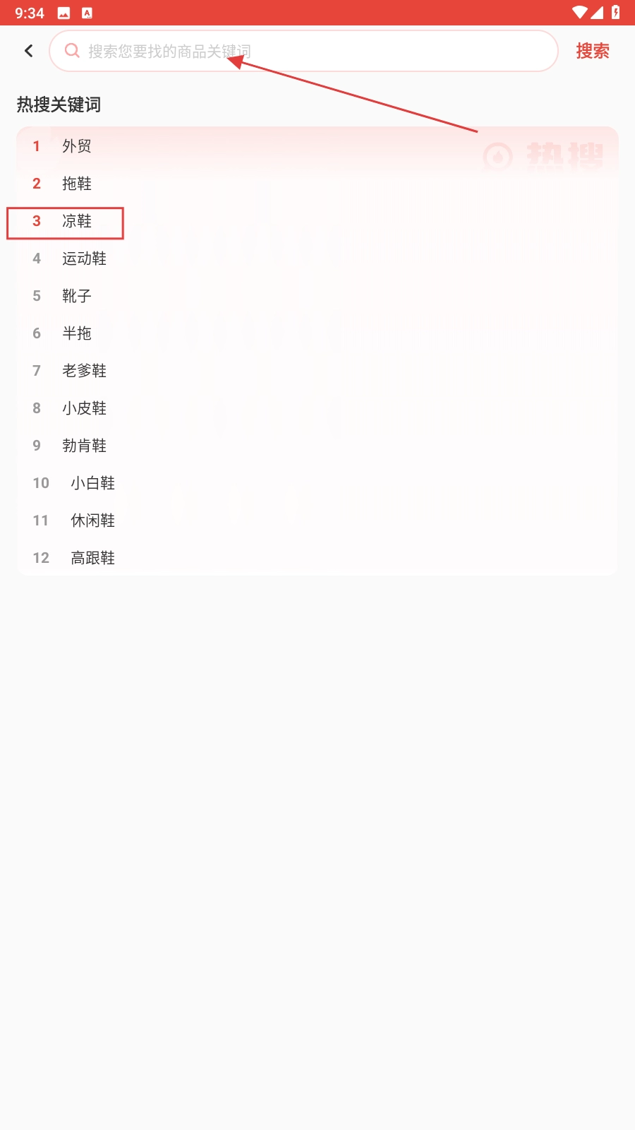 进入搜索页面后,能直接选择热搜关键词【凉鞋】,以此快速搜索到对应的商品。