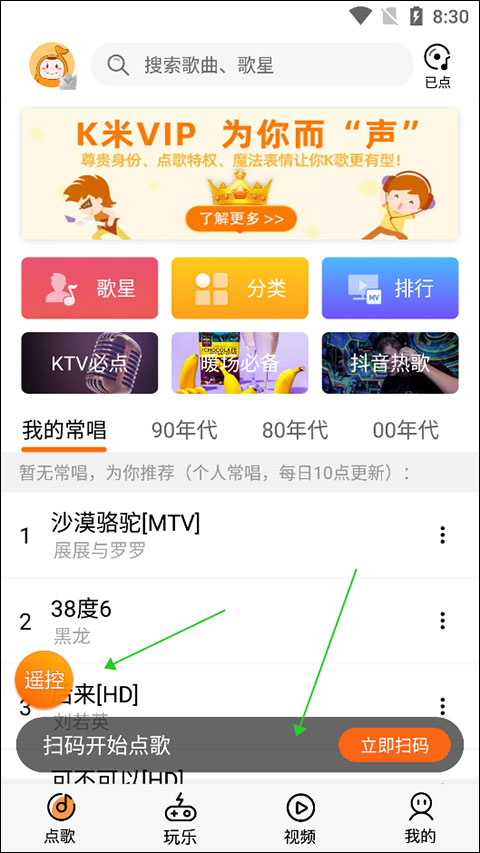 如果应用中没有用户的歌曲,可以按照上述方法先将自己想唱的歌曲导入到应用,然后在首页中通过扫码或遥控来唱自己的歌曲了