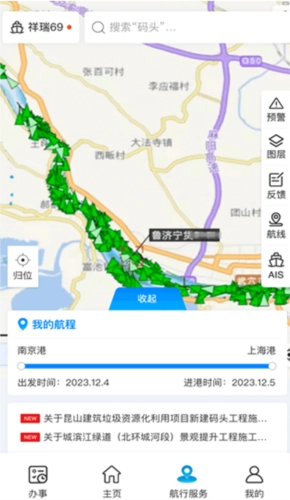 提供航线规划、预警信息查询、图层切换、问题反馈、我的航程等服务。可根据船舶实时船位和航行计划,智能推送水文气象、交通管制、锚地、水上服务区、船厂、泊位等信息。