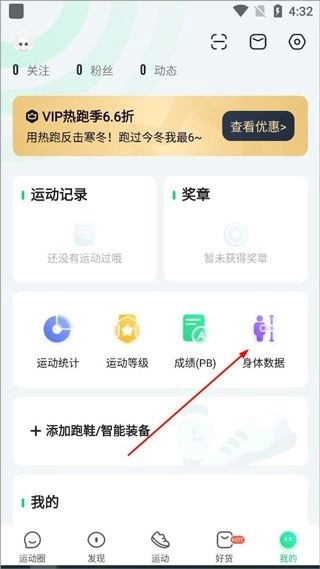 打开咕咚健身应用,完成咕咚智能设备的绑定操作后,进入“我的”页面,即可查看身体数据。