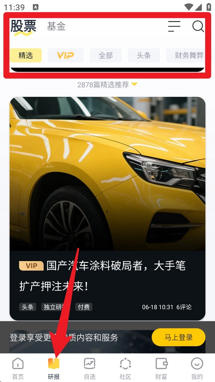 点击底部导航栏的研报按钮,进入后能浏览精选、VIP、全部等分类,还可以查看每日更新的行业深度分析以及个股独立研报内容。