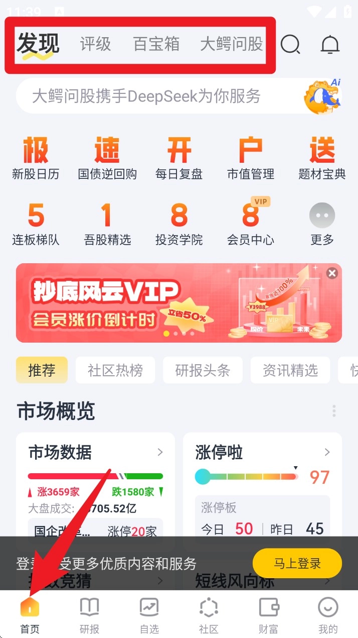 打开App后会默认进入首页,向下滑动页面就能看到市场总览、涨停雷达、新股日历等热门功能模块;点击顶部的发现、评级等栏目,则可以切换浏览更多投资相关内容。
